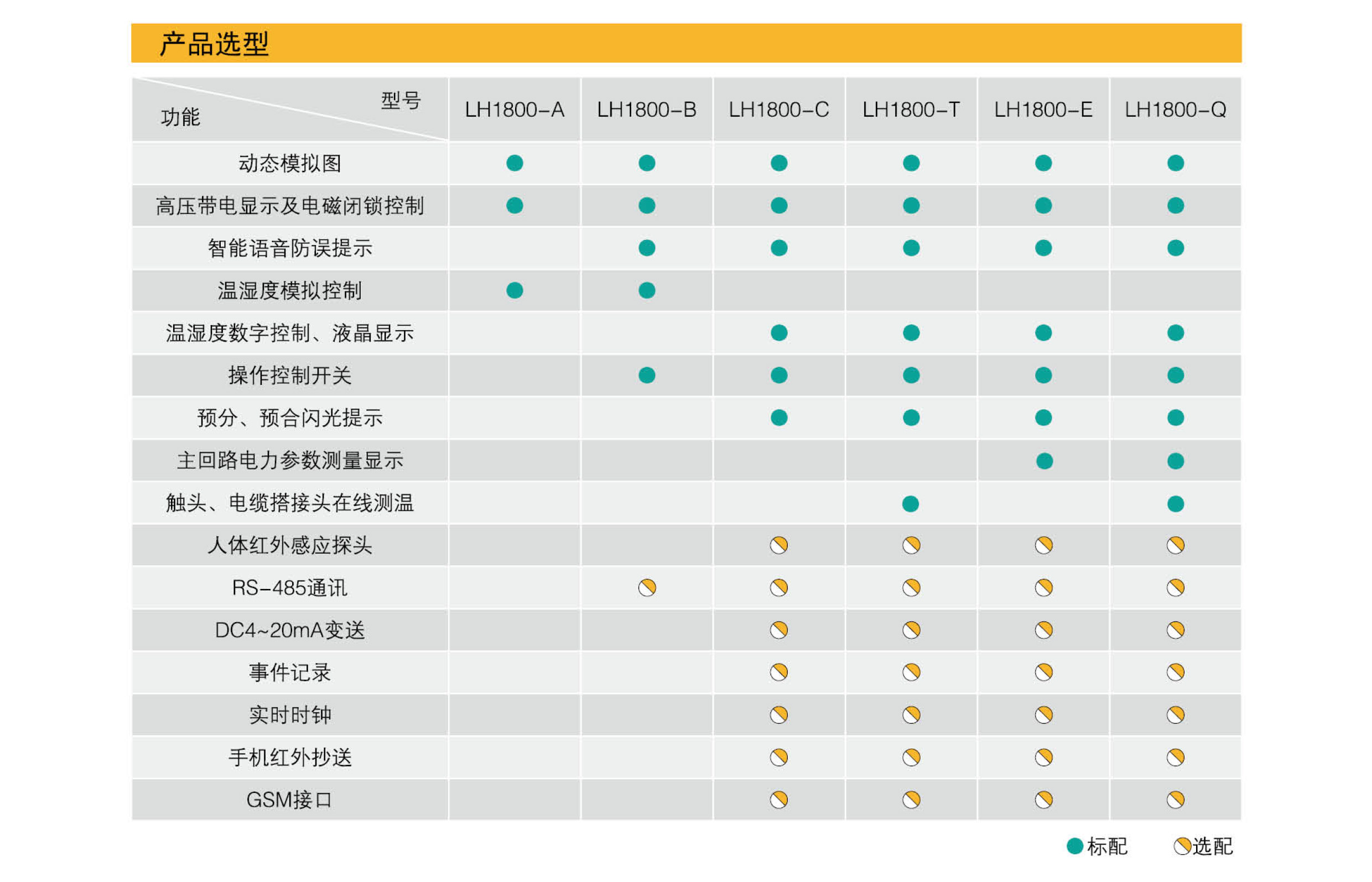 该系列产品具有动态模拟指示、高压带电指示、电磁闭锁控制、语音防误提示功能及温、湿度控制等功能,同时还可选配RS485通讯功能,并且可根据用户要求在装置上安装对应的控制开关;同时该系列产品还具备强大的扩展功能,用户可根据需要选配相应的功能及产品,选配功能如下: