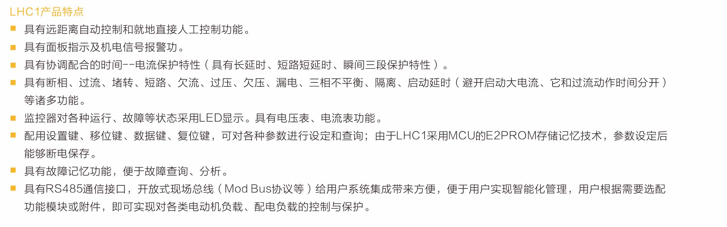 LHC1模块化单一结构形式,继承了断路器(熔断器)、接触器、过载(过流)保护器、欠电压、缺相保护器、电压表、电流表、漏电、隔离器等电器元件的综合功能。应用MCU数字处理技术、测量精度高、线性好、故障分辨准确可靠、抗干扰能力强。具有控制与保护功能集成化,结构模块化,体积小,对环境污染的防护等级高,安装使用及维修操作方便等一系列优点。主要用于交流50Hz (60Hz)、额定电压至690V、电流自0.16A至100A的电力系统中接通、承载和分断正常条件下包括规定的过载条件下的电流,且能够接通、承载并分断规定的非正常条件下的电流(如短路电流)。